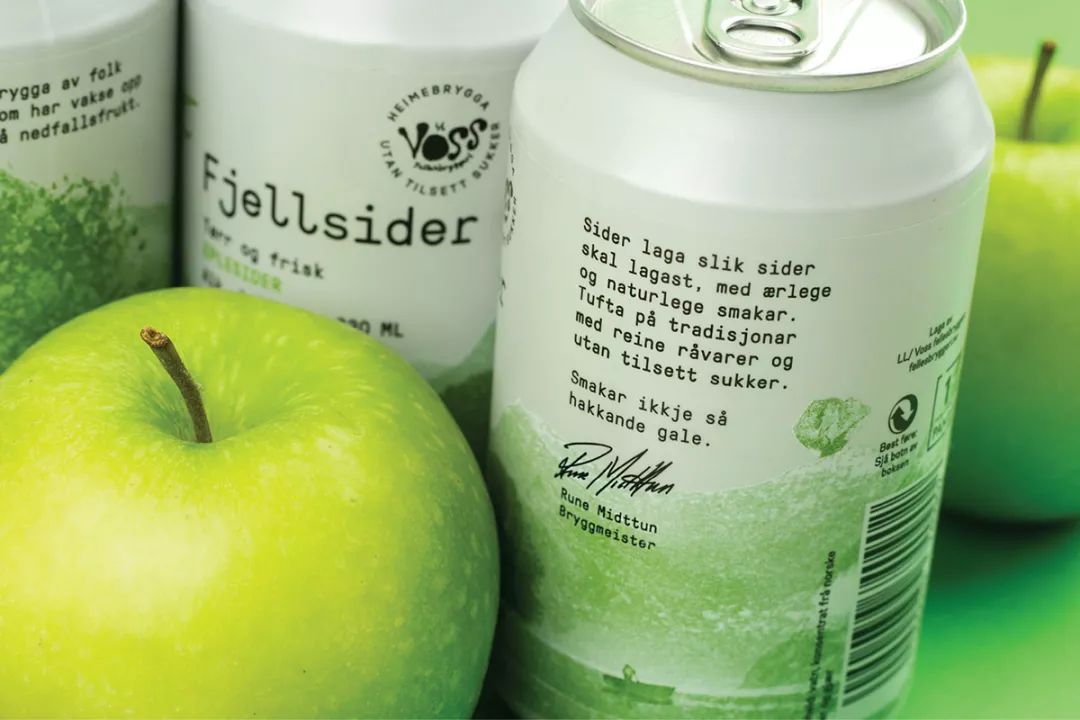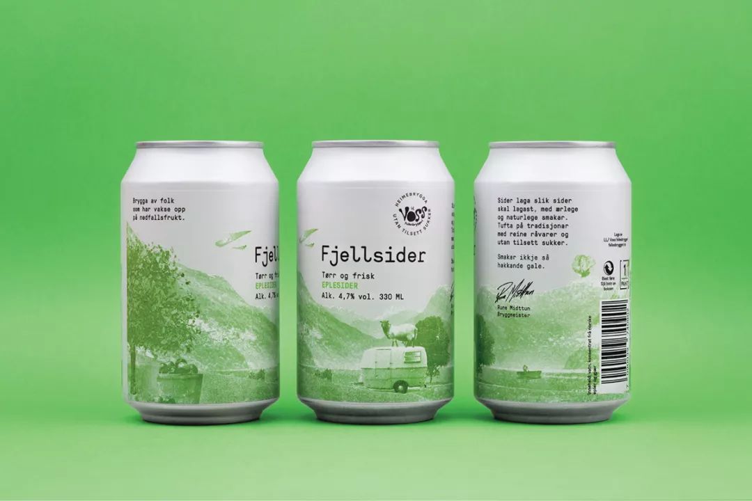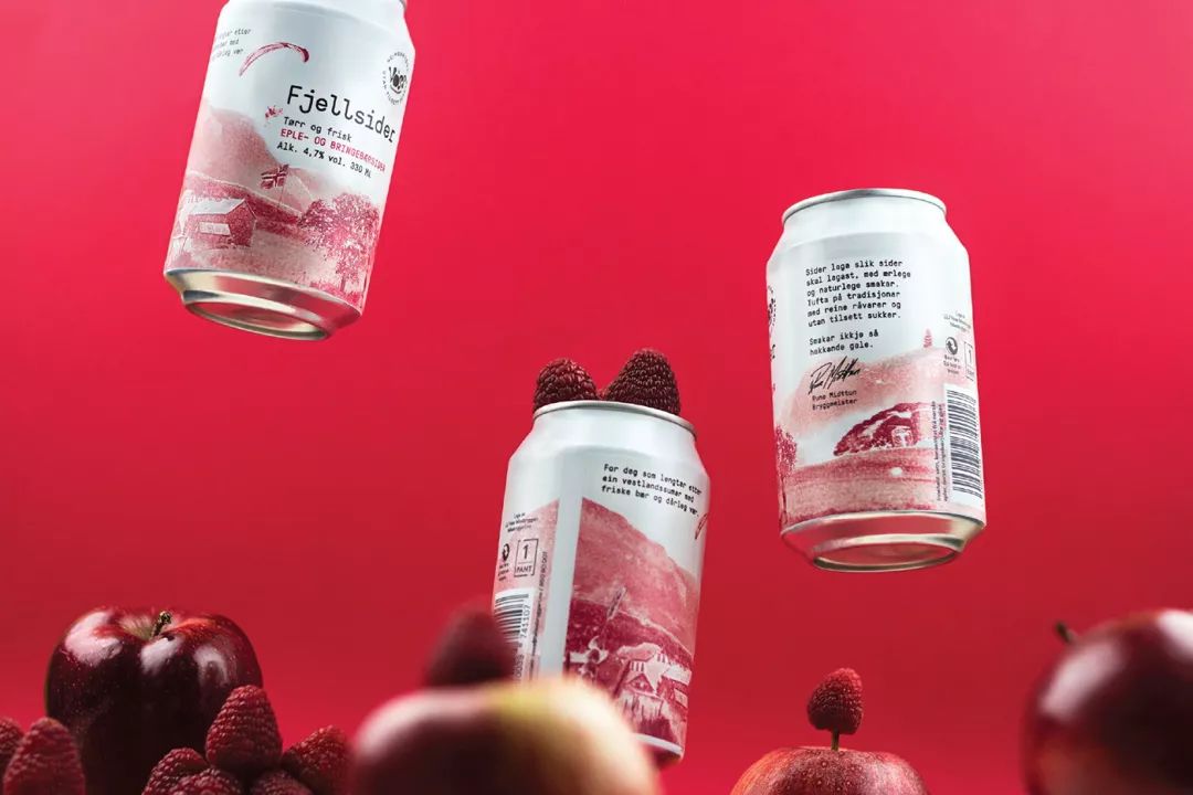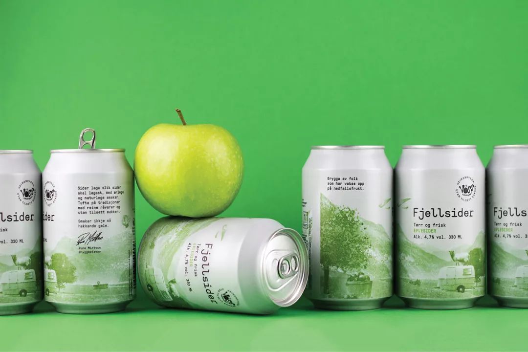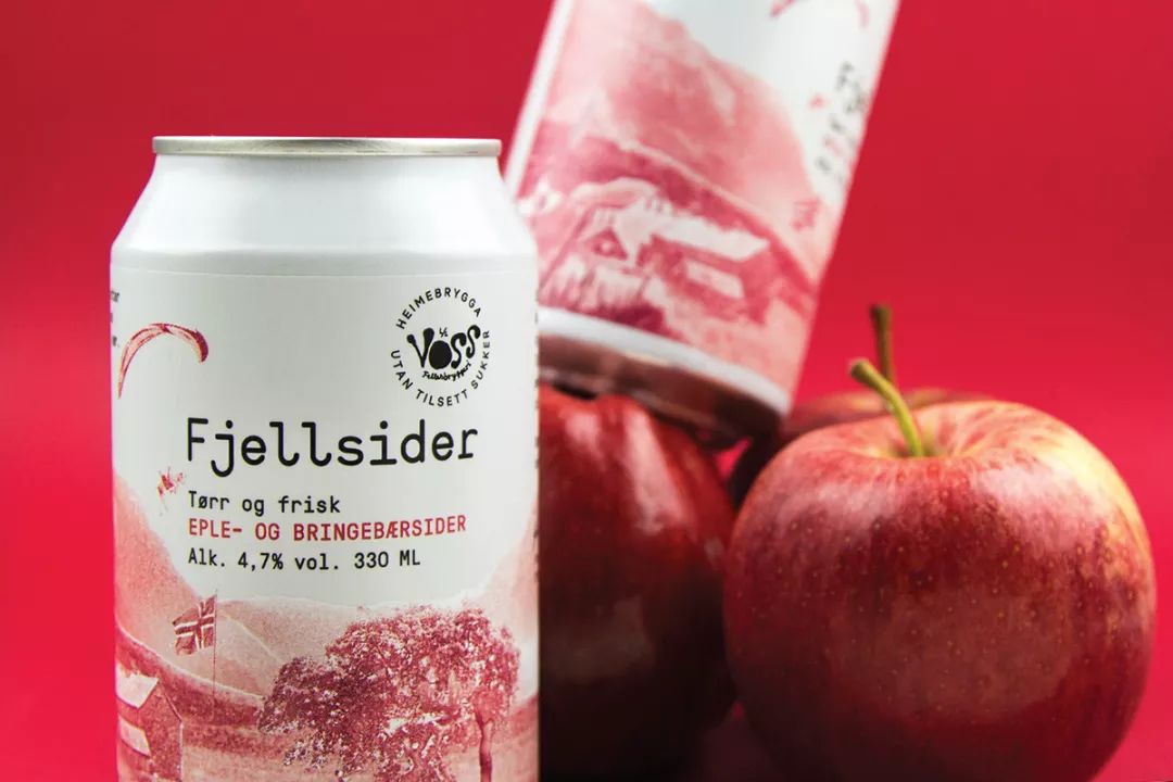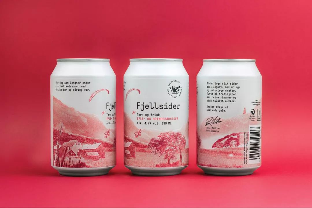 Voss Fjellsider 是一款蘋果酒品牌,挪威設(shè)計團(tuán)隊為其設(shè)計的包裝,設(shè)計師為包裝繪出一組山間風(fēng)景插畫,使用絲印的工藝制作而成,畫面以紅蘋果、青蘋果兩塊單色呈現(xiàn),很好的呈現(xiàn)了酒與蘋果之間那種朦朧的感覺。