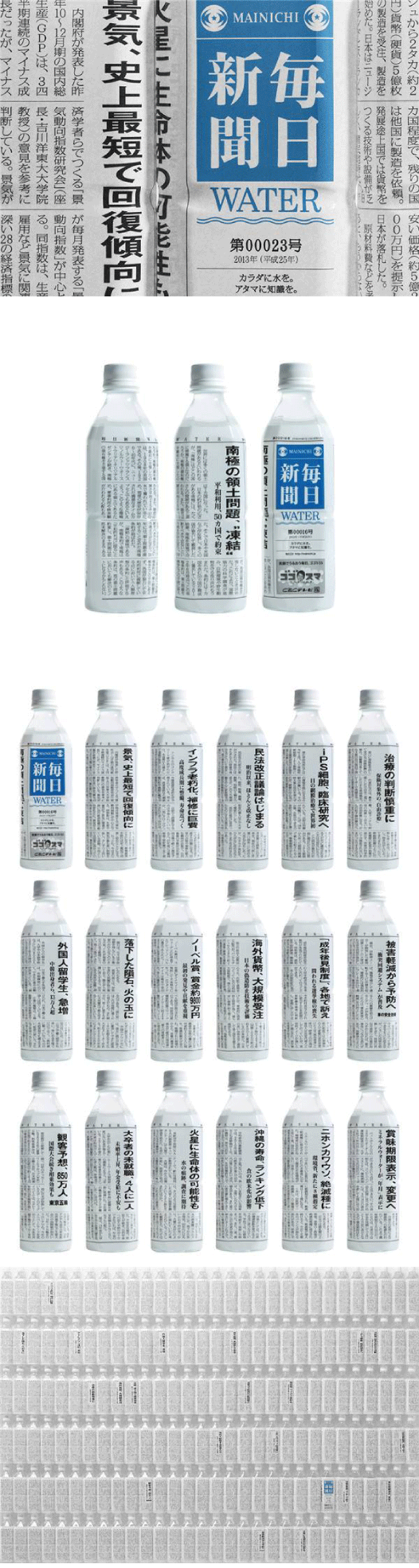 日本的每日新聞發(fā)現(xiàn),買報(bào)紙的年輕人數(shù)量不斷降低,而買瓶裝礦泉水的年輕人卻有所增加。于是設(shè)計(jì)師 Yoshinaka Ono為每日新聞設(shè)計(jì)出承載新聞的礦泉水瓶,一個(gè)月內(nèi)將 31 款新聞瓶子成功推入市場(chǎng)。一個(gè)意外收獲是,用報(bào)紙做產(chǎn)品包裝,逼格不僅沒有降低,而且在貨架上的識(shí)別度也很高。最終在一個(gè)月的時(shí)間里,幾乎每一個(gè)零售超市平均售出3000瓶這樣的News Bottle礦泉水??梢哉f,《每日新聞》既挽提高了銷量,又將用戶引向了移動(dòng)端,包裝的作用意義非凡。